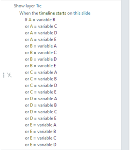 I've added a trigger on the results slide that shows the 'Tie' layer in the event that any of the variables (A-E) are the same as each other.