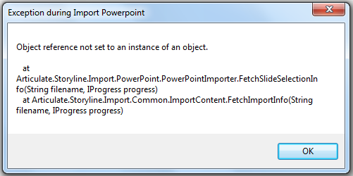 Thanks Ashley. I was able to do a repair for Storyline and that seemed to solve the issue. I will tell you though the it all started after I did an uggrade to Studio 13, and then found it was not compatible with Stroyline. I had to uninstall Studio '13 and reinstall Studio '09. at which time the import process began failing. All good now.