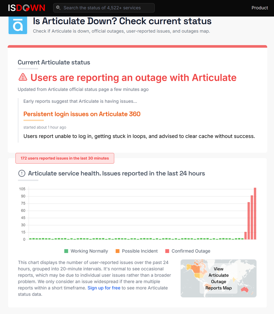 Thanks for sharing this and for flagging the delay. You’re right that there was an outage earlier that affected access to some Articulate 360 products. Our team was already working with our cloud service provider when those early reports appeared, and we updated the Articulate Status page as soon as we confirmed the impact.