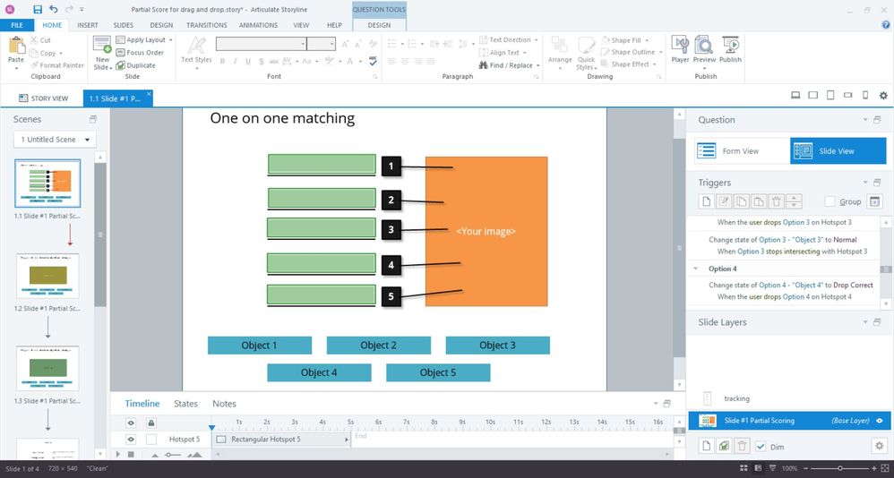 Then, as the OneOnOnePartial variable changes, it triggers the (behind the scenes) multiple choice question to score 0-5 depending on how many Drop Corrects there were.
