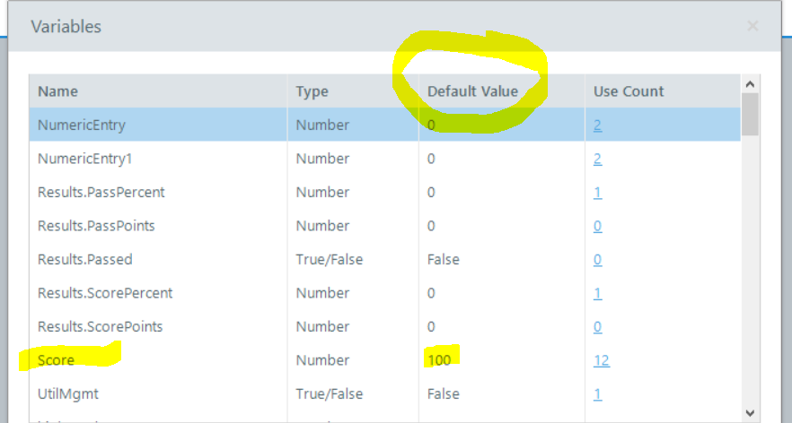 I've also tried this option using a question slide with a NumericEntry text entry field to equal my variable Score, then submit the Numeric interaction to the results slide. In testing it on SCORM Cloud, I still can't get it to work. I've been over and over other posts here and here about using JavaScript, but that hasn't worked yet, either. Would love some help!