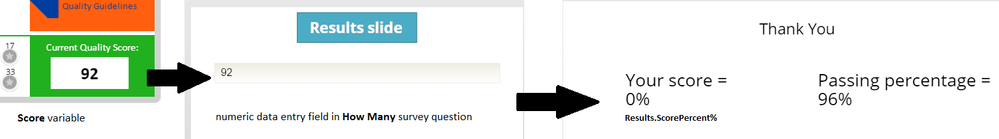 I want to set the results score equal to the variable Score. (It starts at 100% and will go down if the learner selects the wrong answers.) It won't ADD, I want it to be the same. I've tried setting the variable equal to a How Many data entry field, and that works. It's the next step - getting the numeric entry to be the results score - that is not working.