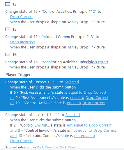 here is your original file updated with my trigger - see if it works for all your combinations. In the normal course of using the Pick One with the Correct/Incorrect buttons offstage, the Correct trigger has the AND condition and the Incorrect would have the OR condition. Because you have so many combinations I find it easier to validate the Correct drops and then the incorrect drops have an overarching trigger that if it's not correct then it's incorrect.