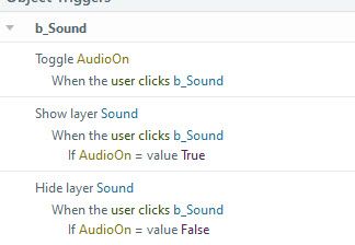 Note: The toggle trigger changes the AudioOn variable from True to False as you click the button that plays the sound. If the variable is True, it will show the Sound layer. If it is false, it will hide the Sound layer.