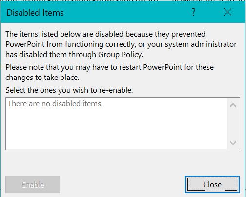 File > Options > Add Ins > Disabled Items / Go > "There are no disabled items."
