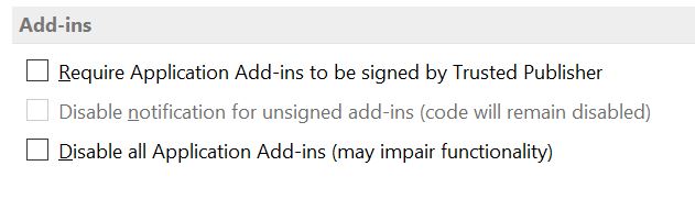 Trust Center > Trust Center Settings > Add-ins > there was no check mark on the "Disable All Application Add-ins"