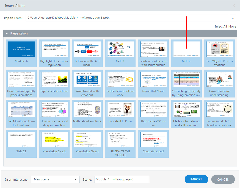After spending the day cranking out PPTs (with audio no less!) into Storyline 360 I am now getting the dreaded failure to import message (The value must be between 0 and 216000000. Parameter name: value....). I am not seeing what is different. Why after a day of moving PPTs into Storyline is it suddenly not working? I am on the same laptop. Any insight is appreciated. I am at my wits end.