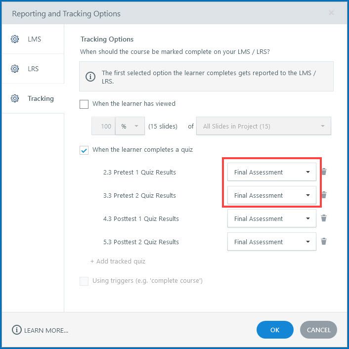 The example above is for a course with just one Pre-Check and one Final Assessment. In your case, all four quizzes need to be listed.