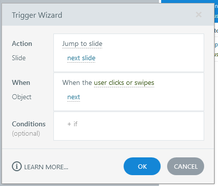 3. Set When to "user clicks or swipes" --> "Next" (change this to previous for the previous page trigger). Click OK.