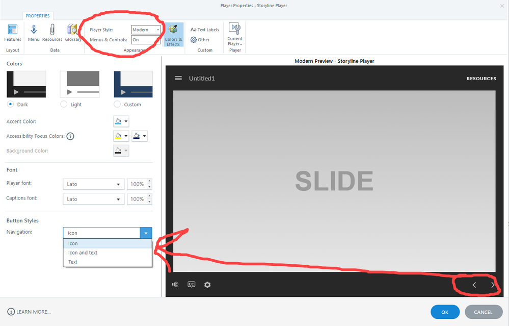 I made a presentation in Storyline 360 with the classic Previous/Next buttons. However, when uploaded to the web, the buttons have been replaced with arrows on a narrow black vertical strip to the right. There's also a Play button on a black screen at the start.
