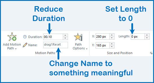 - Set the Length of each motion path to 0 px. That will “move” the item to its starting position.