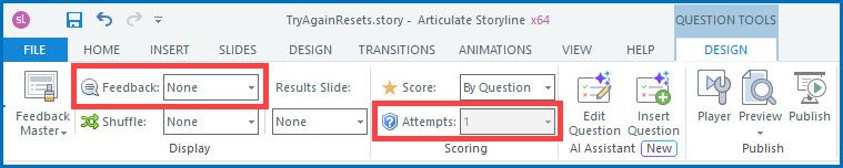 ⚠️ To turn off the try-again functions, reset the Attempts field to 1. When you do that, Storyline will automatically delete the Try Again layer.
