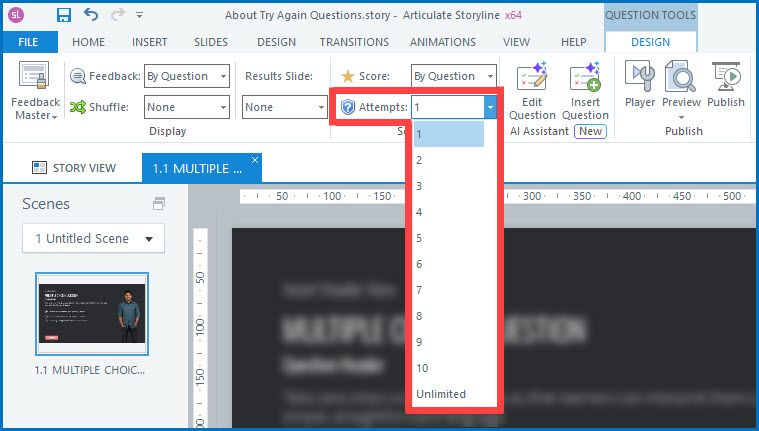 - If you delete the Try Again layer but leave the Attempts field at a number >1, Storyline will still give the user the allowed number of attempts. If the user answers incorrectly, that means they will have to click the Submit button for every allowed attempt before the Incorrect layer will show.