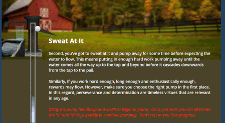 Have you ever operated an old-fashioned well pump? Learn the lesson of the water pump in this "hands-on" interaction.