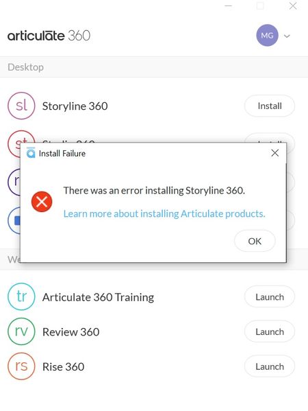 Hi, I´ve installed the Articulate 360 suite successfully, but, I can´t install specifically the Storyline 360 Software. It appears the pop-up below:
