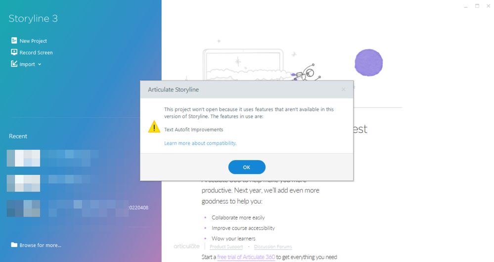 Projects fail to open after updating Articulate Storyline 3 - April 13, 2022 (Build 3.16.27367.0)