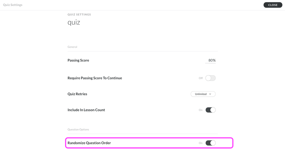 Did you know that you could randomize existing quiz questions in Rise? Just enable that feature right in your quiz settings: