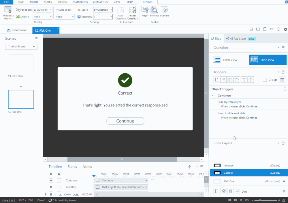 - Select and view the Correct or Incorrect layers and delete the 2 triggers