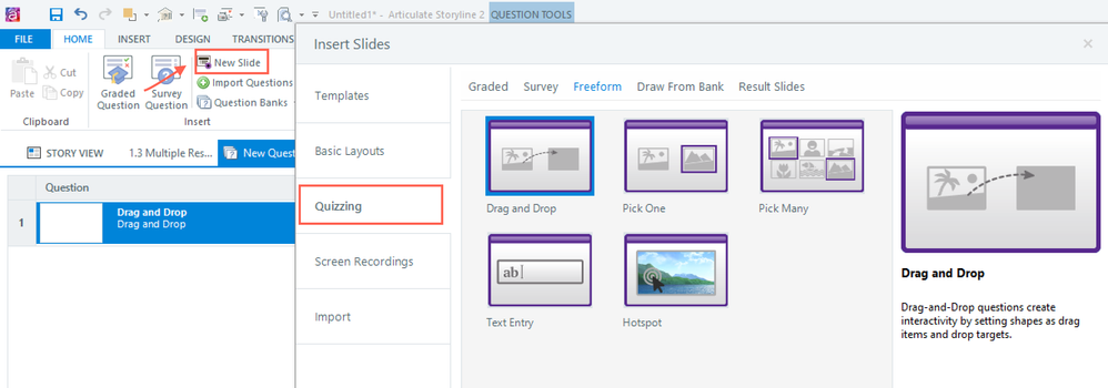 1. Convert an existing slide in a question bank to Freeform (but the Freeform button is greyed out) OR