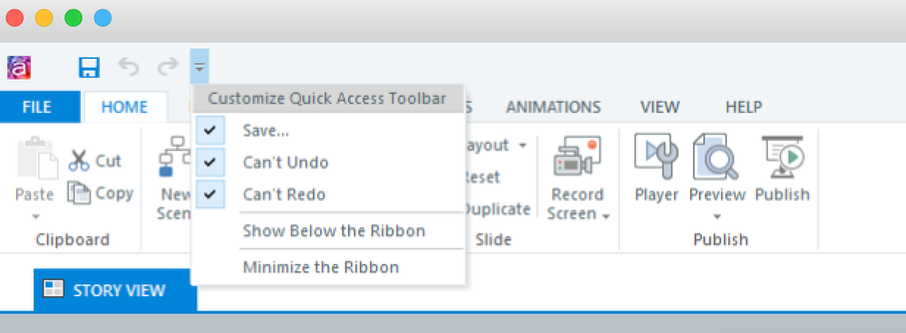 - Hi Michael and welcome to E-Learning Heroes! - You can set up a quick access toolbar and move it below the ribbon if you wish as well: - michaelpolacekCommunity MemberI guess I was asking for a screen shot of what you call the various parts of the editing screens. Is the line where you show the Story View called the Quick Access Toolbar? Thanks Leslie! Michael Polacek, MSn, RN-BC