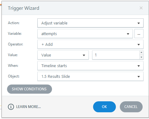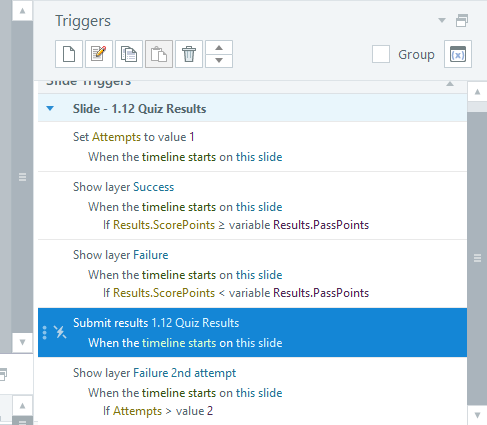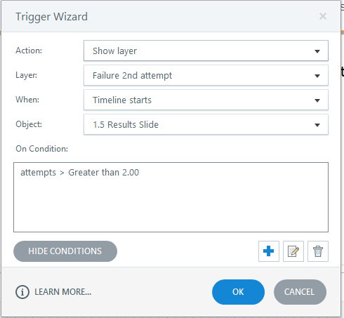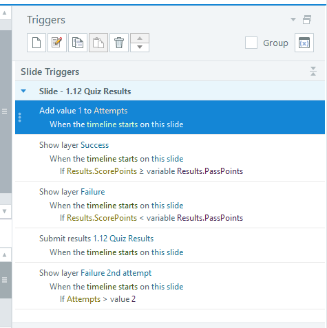In developing my quiz I wanted the learner to have a 2nd attempt at passing, if they failed the first time. But I only want a total of 2 attempts. To get this to work I have created 3 layers on my results slide - Success, Failure and Failure 2nd attempt. What I am trying to do is to is get the 2nd layer to display only after the user has attempted the quiz a 2nd time. Because the quiz resets after the users clicks retry quiz, I cannot get it to hide the failure layer (2nd time around) and display the failure 2nd attempt layer.