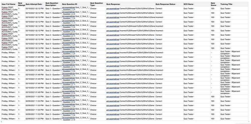 I performed another test where I changed the course completion criteria for the Rise course. I based completion of the module on viewing content (90% viewed) instead of passing a quiz. I wanted to see if the quiz data would still be reportable through Cornerstone. I was happy to find that you still can retrieve the quiz question answers even if no quiz is designated in the LMS settings.