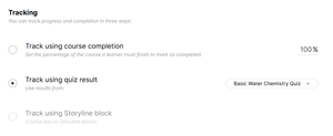 2. Tracking Options: Under Tracking, select Track using quiz result. Click on the quiz name to view and choose other quizzes within your Rise course if not already selected.