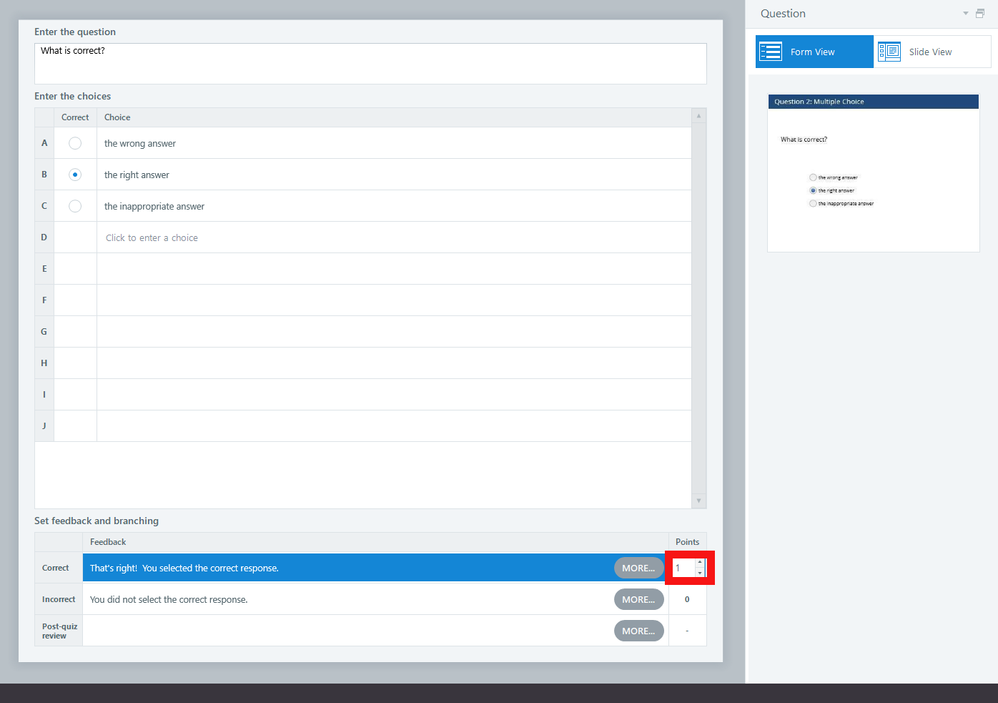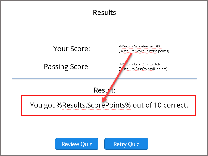 - On the Results slide, add your phrase, and insert a reference to the variable that contains the user's score points. This image shows what that would look like for a quiz with 10 questions.
