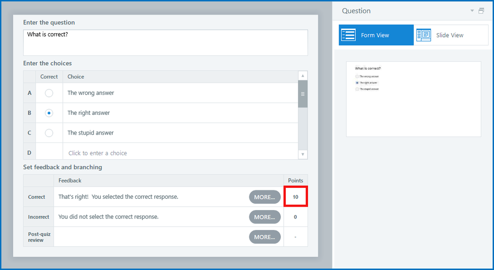Note: Percentage ranges from 0 to 100%. Points are based on how many point you assign to each question. The default is 10 points per question. However, in Form View, you can assign a different point value.