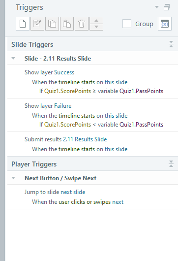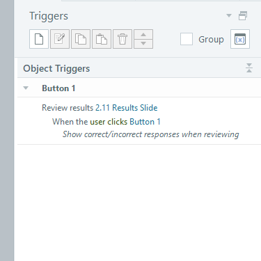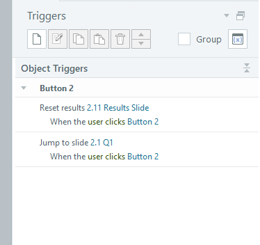 Yes, the triggers are nothing special or custom, only the usual ones that part of the slide when it is added to a project. See below. Not sure what you mean by bypassing the rest using the menu.