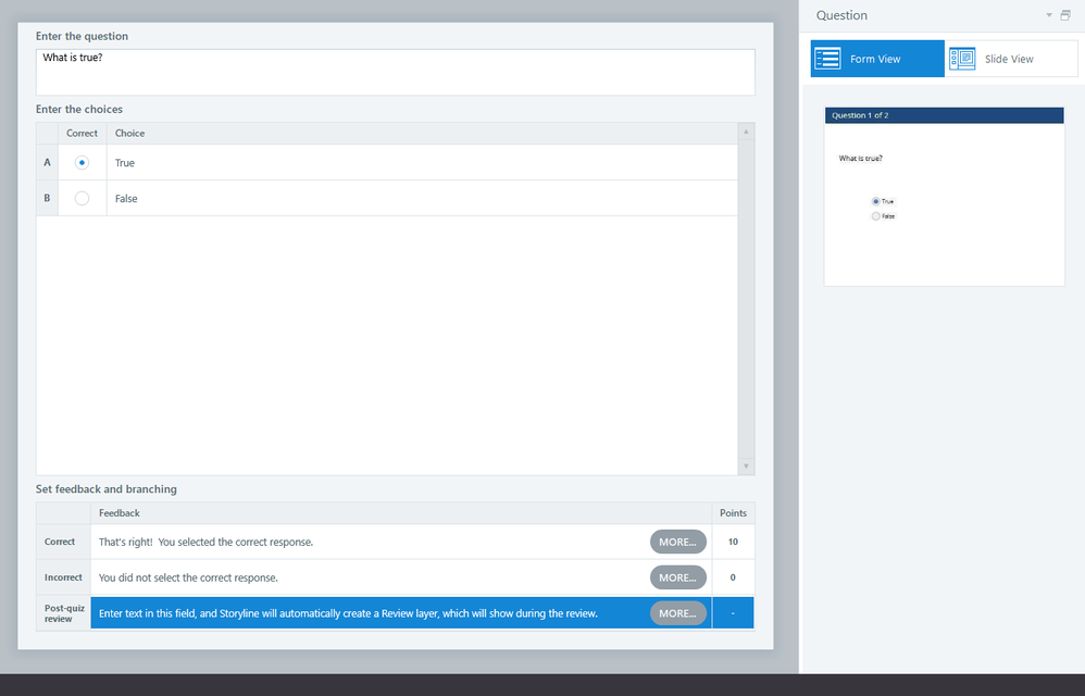 1. Yes, you can show feedback on a Review layer. Storyline will create one if you enter any text in the Post-quiz review field in Form View. Or you can create your own.