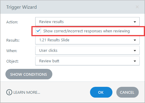 By default, Storyline indicates the correct responses. But you can turn that off by editing the Review results trigger. Just deselect the checkbox for showing responses.