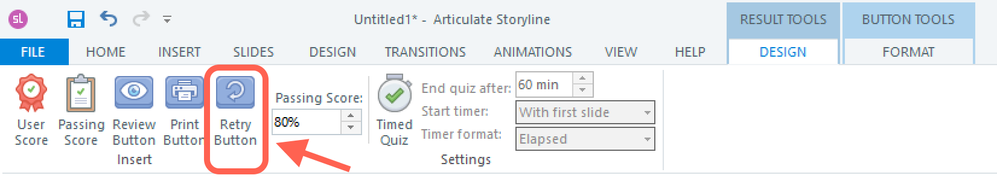 Hey John! Check out the Results Tools: Design tab. Then click the Retry Button option, and click-and-drag to add it to the slide. I hope that helps!