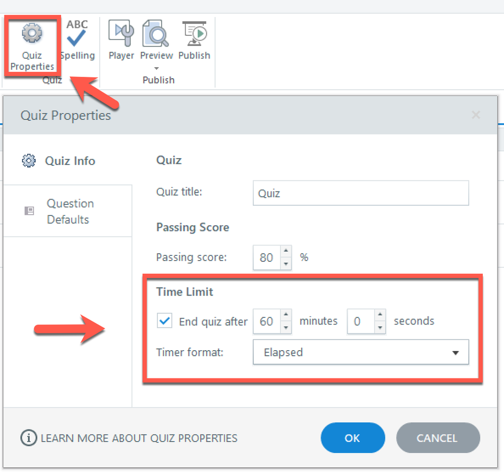 Thanks for reaching out! Assuming you're referring to Quizmaker 360, you can find the timer options by going to the Home tab and selecting Quiz Properties.
