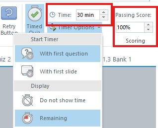 I have created a simple course to better explain this issue, which can be downloaded below, and the output can be viewed here. Two quizzes have been set up that draw questions from the same bank with different test durations of 30 minutes and 60 minutes. “Start timer with first question” has been chosen for both quizzes and they have been set as Knowledge Checks as we don’t need to track the completions.