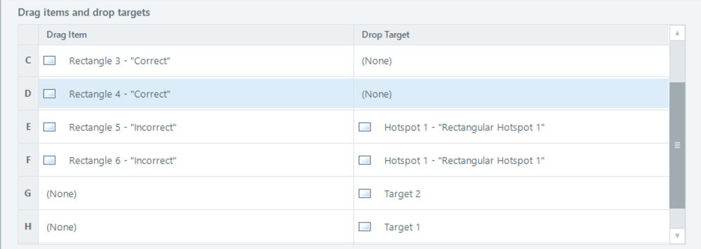 If it requires choosing exactly two options—no more, no less, I suggest placing two target zones for users so they won’t get it wrong. The secret in this simple approach is to create a trigger that tells the system which feedback layer to display, rather than relying on the default one. No variables are needed.- Create a hidden drop target for the two incorrect items outside the canvas. When submitting, their state will change to Drop Incorrect if they were dropped on the targets.