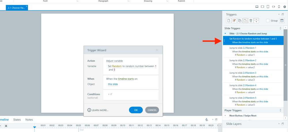 On Slide 2.1 there is a trigger on timeline start that chooses a number between 1 and 5.