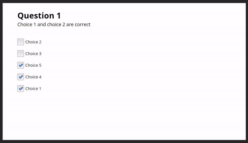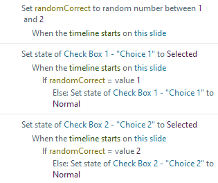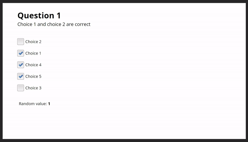 You can also create a random value variable, like %randomCorrect%, that randomly generates either 1 or 2. If the value is 1, choice 1 will be pre-selected; if the value is 2, choice 2 will be pre-selected. This allows for different correct answers to be selected each time the question is loaded.You can apply the same logic and use different random variables/values to ensure that other answers are also randomly pre-selected when the question loads.