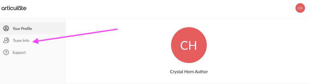 You can find out who your Articulate 360 Team admins are by clicking your avatar in 360.articulate.com, choosing Account, and clicking for Team Info:
