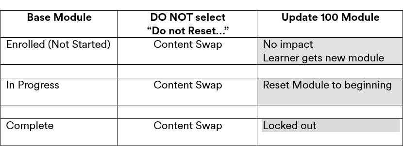 In Hire Road, we have the ability to maintain module data when we do a content swap. Here is the language: "Do not reset module data for learners on content change." We do select this when we swap out Zip file modules.Here is a graphic I'm using to communicate this to our management team as I explain the past week of testing. The purple highlights in the top table is what has changed for us. Before Update 100 the top table section would all be green, meaning the learner was not affected regardless of their module status.