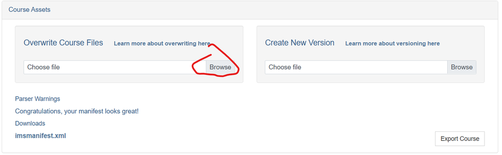 - Scroll down in SCORM Cloud and replace the SCORM Package by selecting Overwrite Course files: