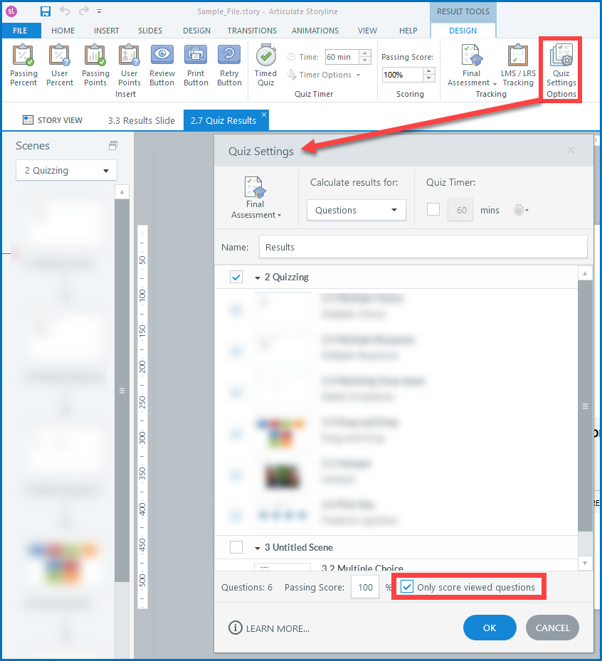 If a learner goes to the Results slide and then exits the course, the score and data will be submitted to the LMS based on whatever questions were answered.