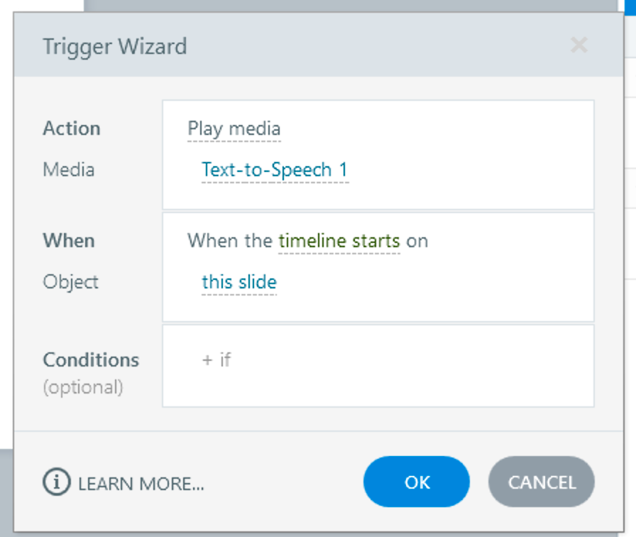 My issue is when I add my trigger: 'When timeline start on this slide, play audio Text-to-Speech 1, if Voiceover(voiceover is the name of my variable) = value True' the waveform that displays in the timeline changes to a speaker icon and appears as an MP3 file, and I cannot then re-position it to an appropriate time on the timeline. OK if you want the TTS to play from the start of the timeline, but when you have more than 1 TTS they need repositioning otherwise the both play at the same time!