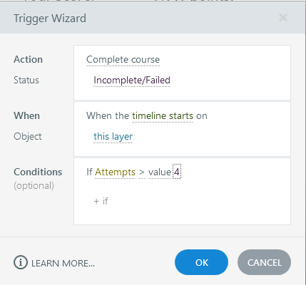 - Add a trigger that shows a message explaining that the user doesn't have any more attempts and will have to contact the training team to reset the course. In addition to the condition about the value of Attempts, this should be based on the user not passing. Thus, the message could appear on the Failure layer.