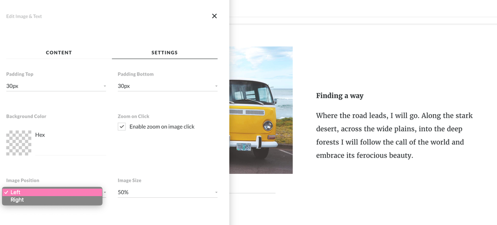 Hi Elizabeth! For Image & Text blocks, you can move the image to the right or the left of the text: