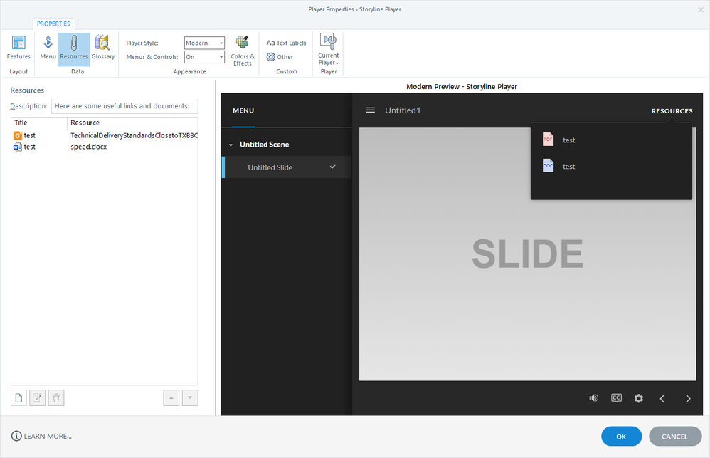I have a number of documents (both .pdf and .docx) loaded into my Storyline Resources. They don't show up, either when I publish locally or in Review 360.