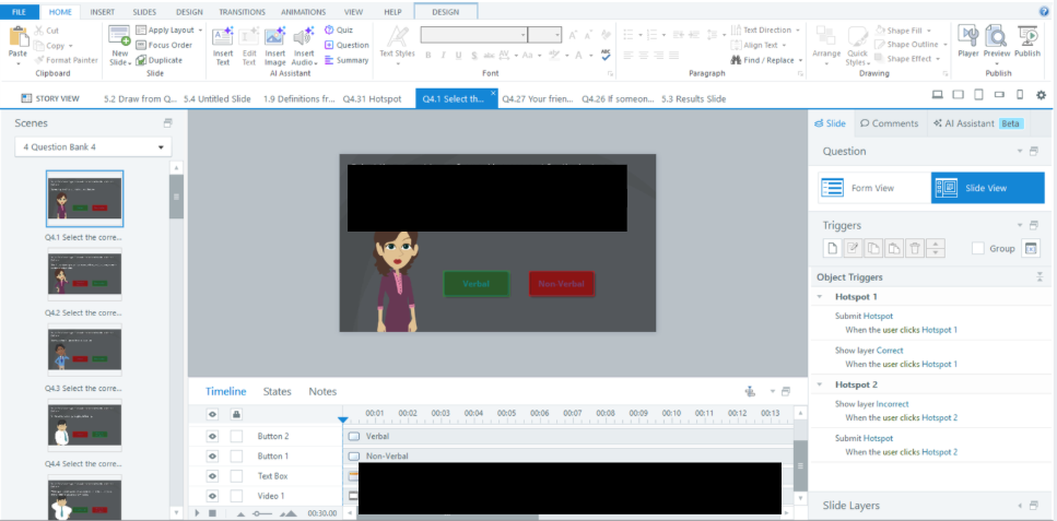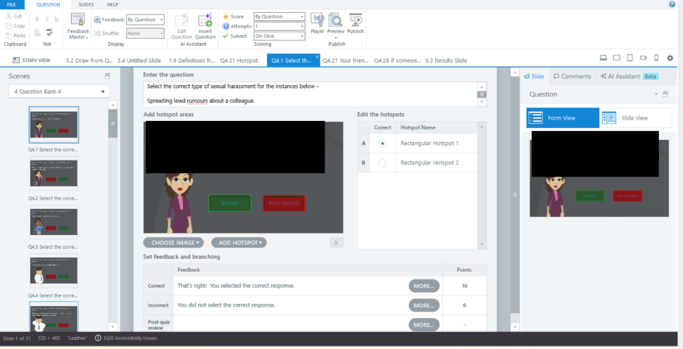 - Hotspot questions — created using Slides → Graded Question → Hotspot. There are two clickable options, and based on selection, correct/incorrect layer is shown.