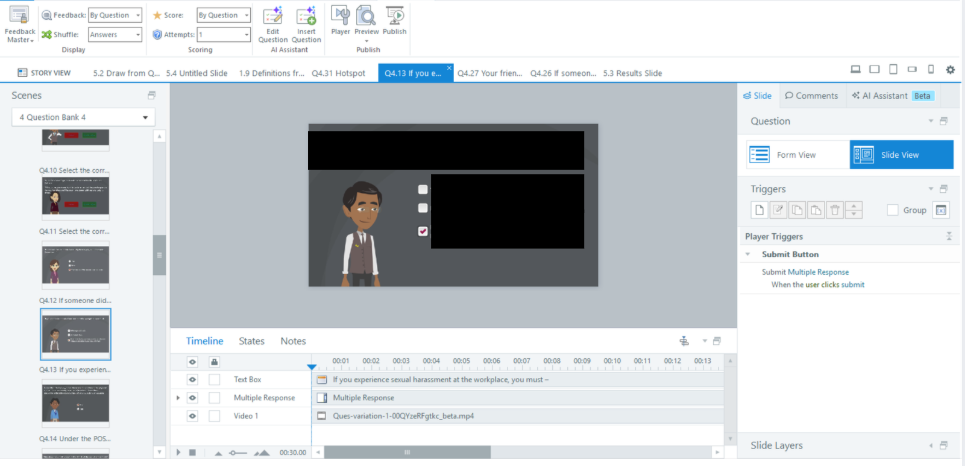 - Standard graded questions — Multiple choice and True/False using Submit button and correct/incorrect layers.