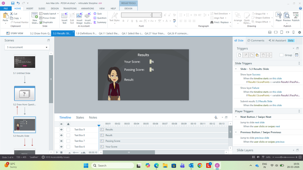 The course is published as SCORM 1.2 and uploaded to an LMS. The result slide is showing an incorrect percentage even when all answers are correct. Additionally, when only one question is answered incorrectly, the score displayed is 80% instead of the expected 93%.