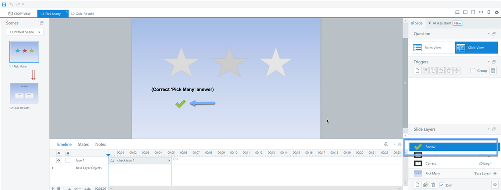 In the meantime, I've built out a simple Storyline example which utilizes an additional Layer titled 'Review'. This Layer, added to my question slide, contains the green checkmark. This new Layer displays under the correct object choice, when a learner reviews the Pick Many Slide. Also, no additional Triggers were necessary as Storyline's built-in Review functionality triggers that Layer to display. However, this configuration only works if the layer is titled 'Review'.